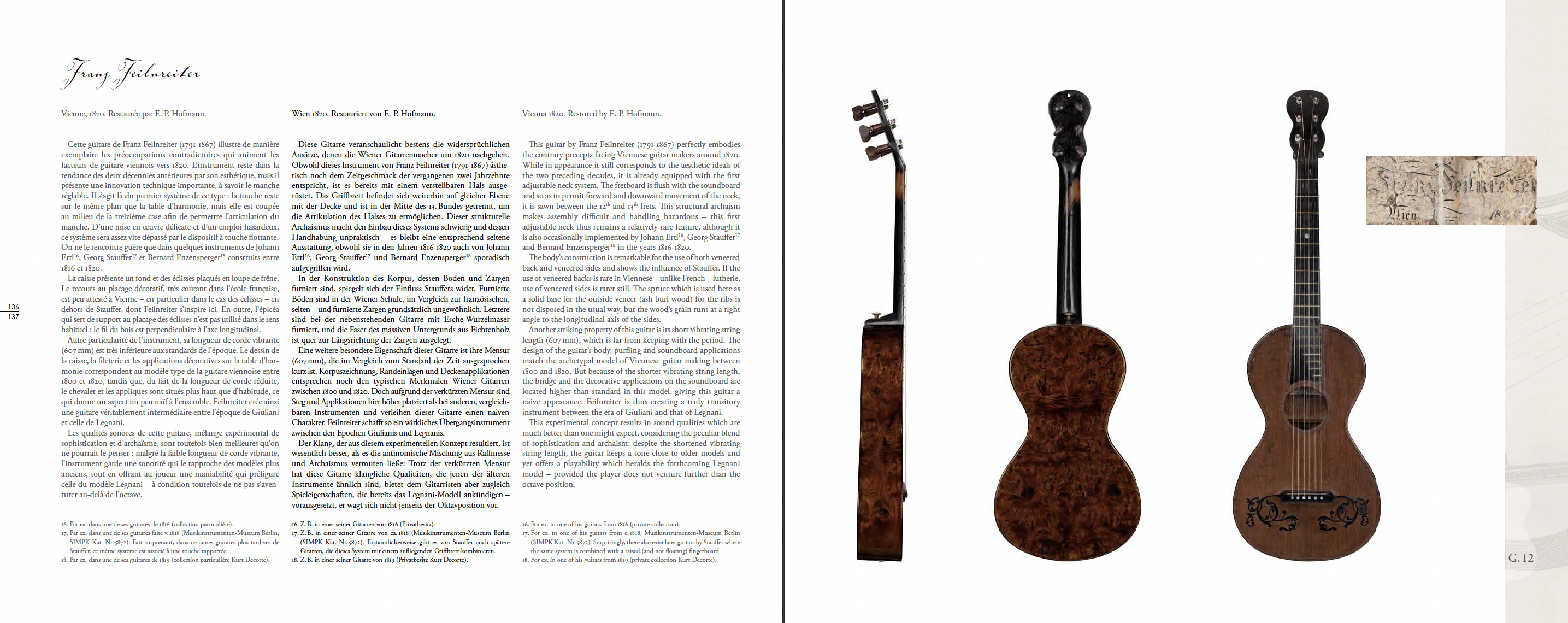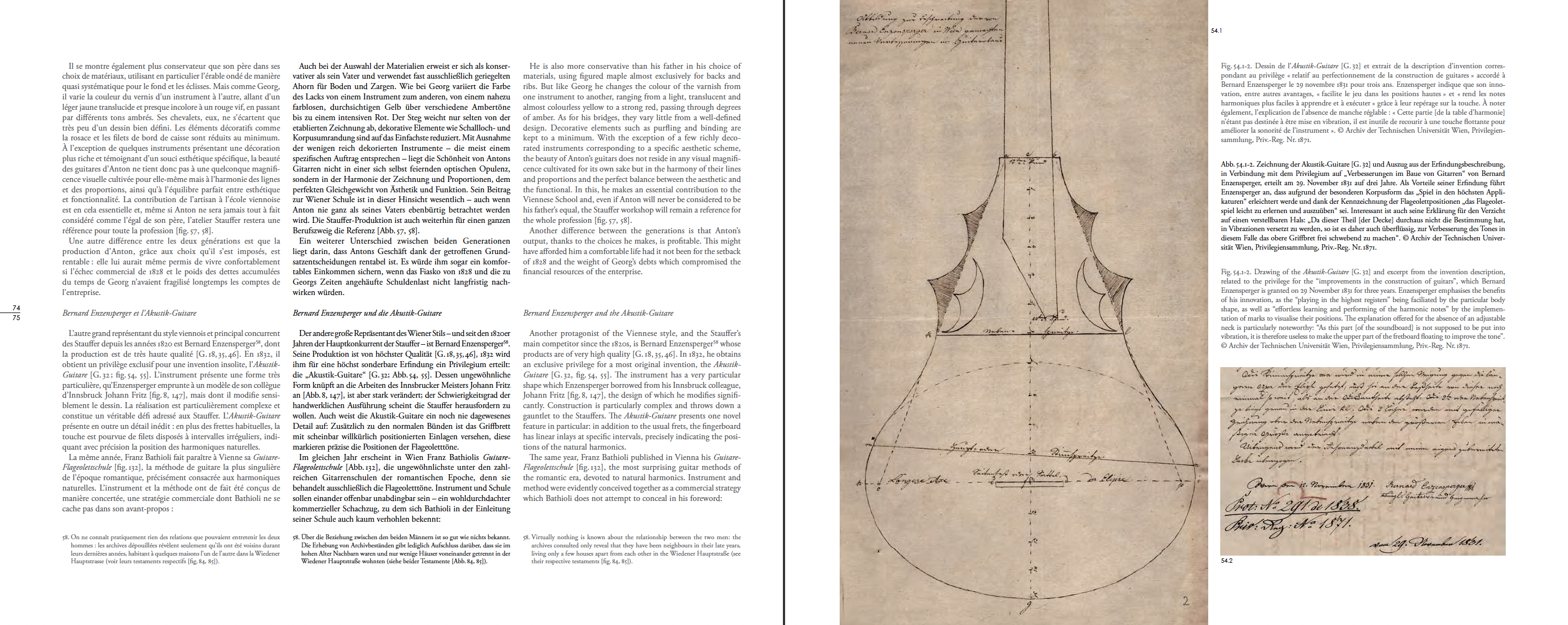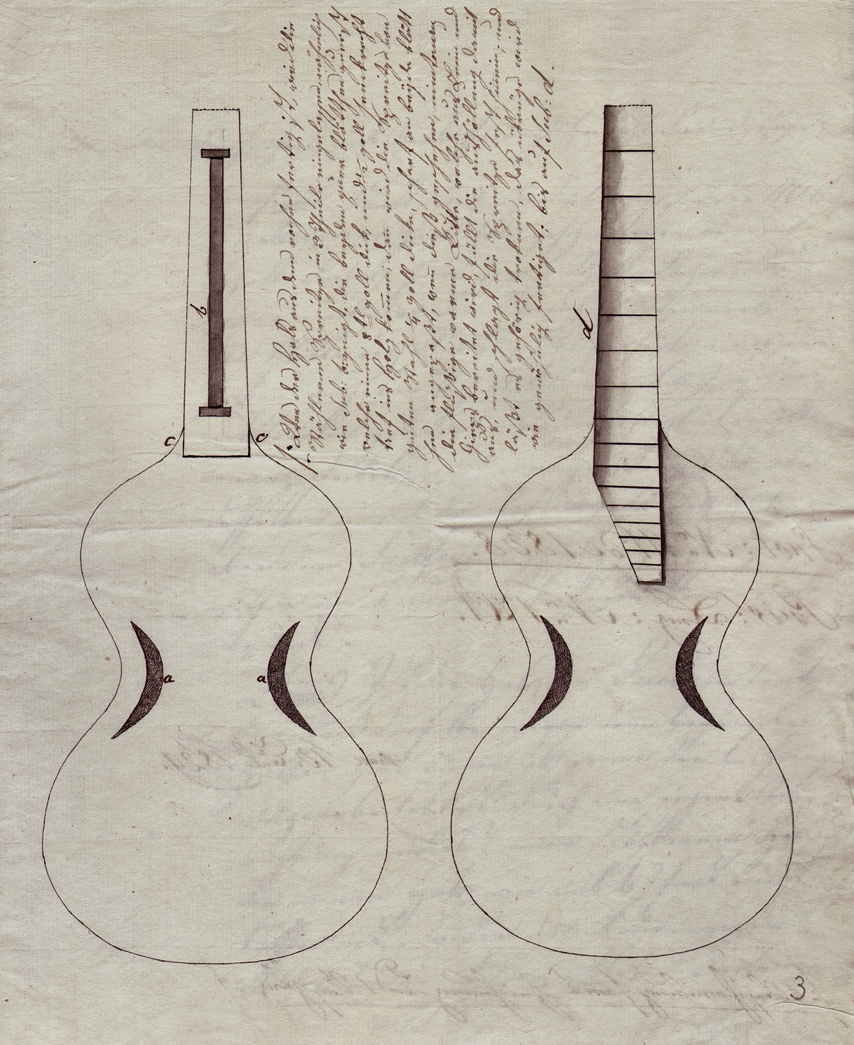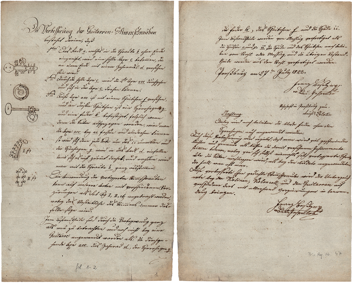 Description d’invention et illustrations correspondant au privilège « relatif au perfectionnement des guitares » accordé à Peter Teufelsdorfer le 13 juillet 1829. © Archiv der Technischen Universität Wien, Privilegiensammlung, Priv.-Reg. Nr. 1761.