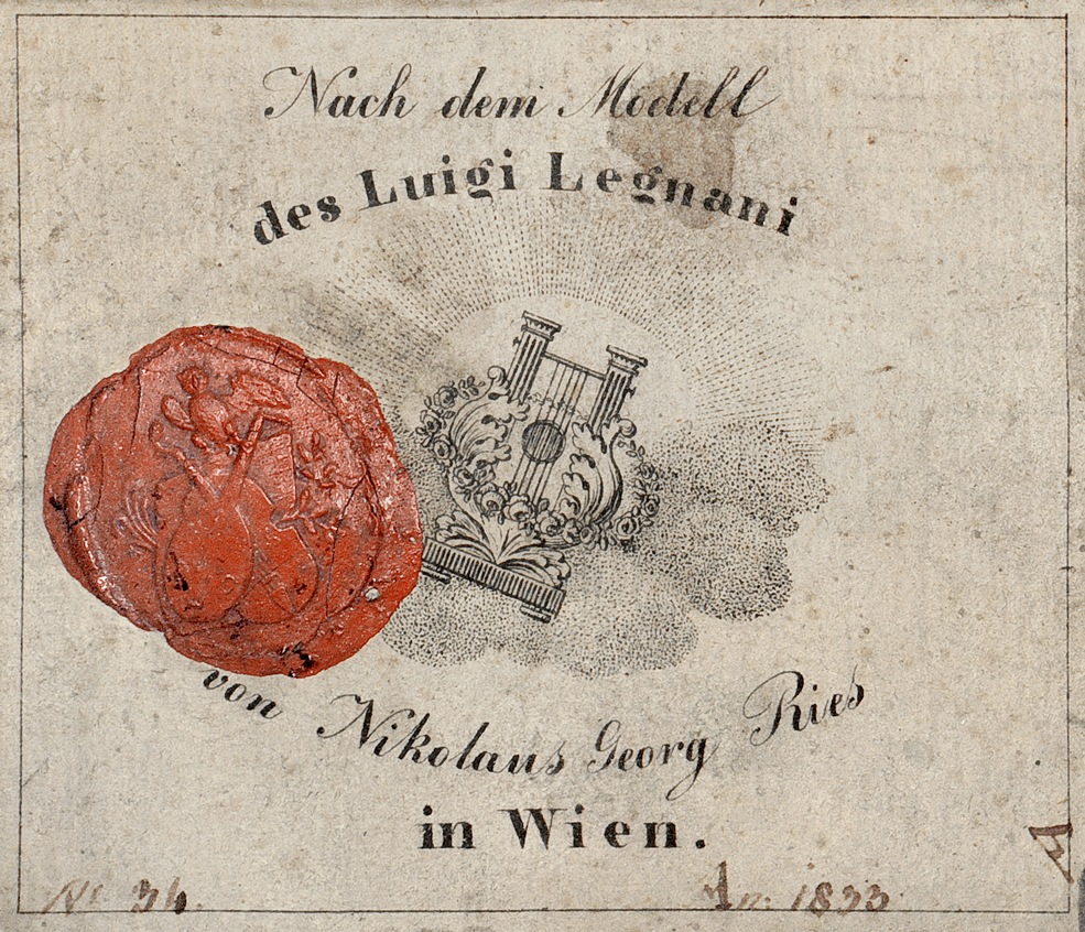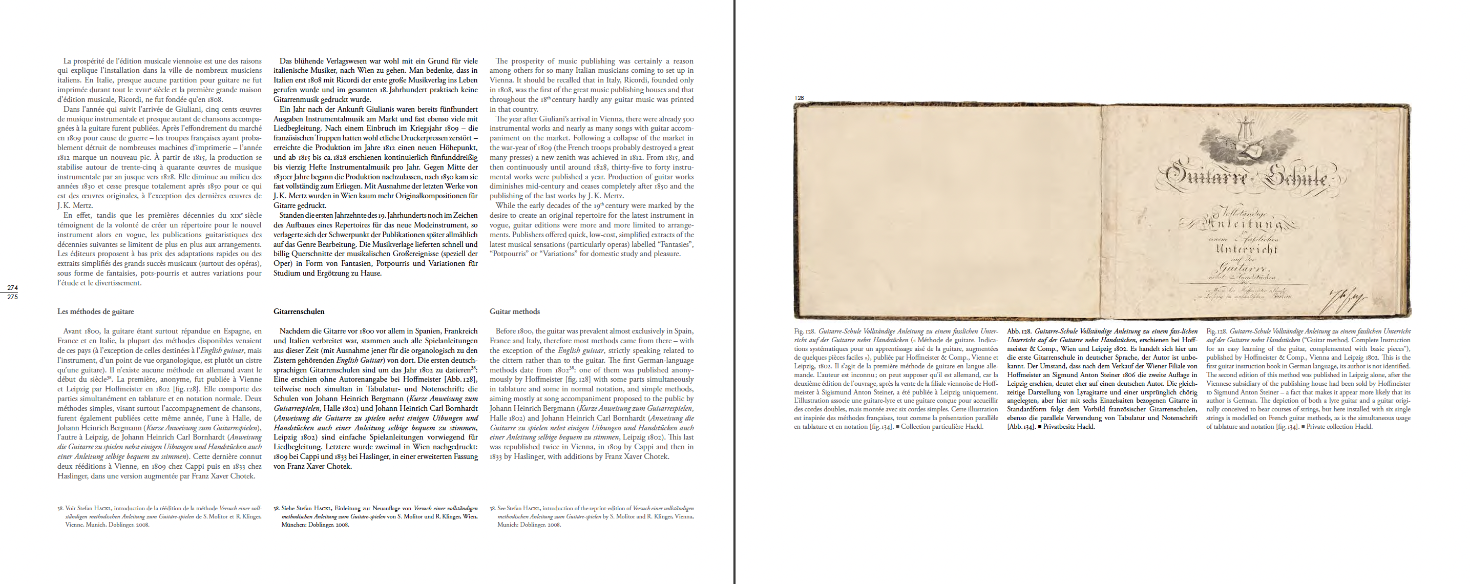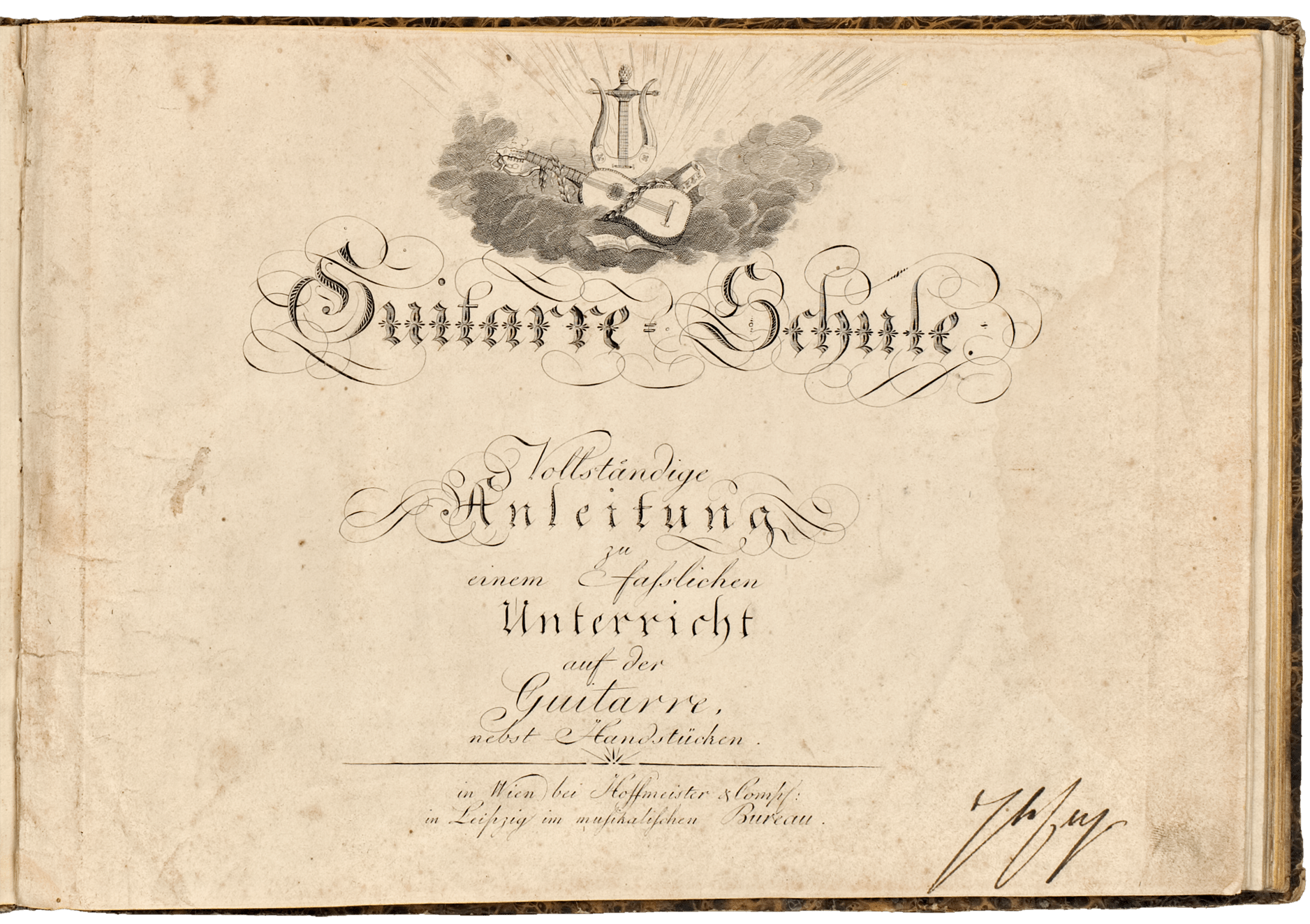 Guitarre-Schule Vollständige Anleitung zu einem fasslichen Unterricht auf der Guitarre nebst Handstücken (« Méthode de guitare. Indications systématiques pour un apprentissage aisé de la guitare, augmentées de quelques pièces faciles »), publiée par Hoffmeister & Comp., Vienne et Leipzig, 1802. Première méthode de guitare en langue allemande. Coll. particulière Hackl.