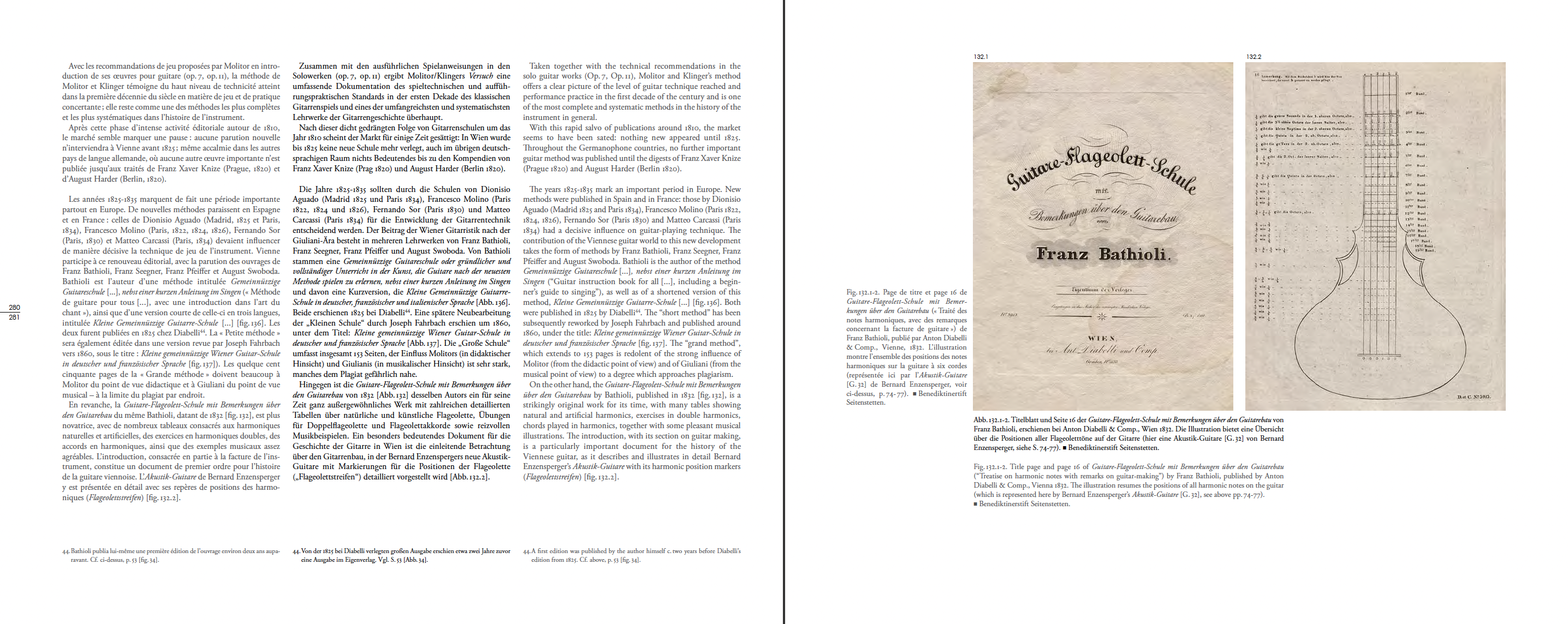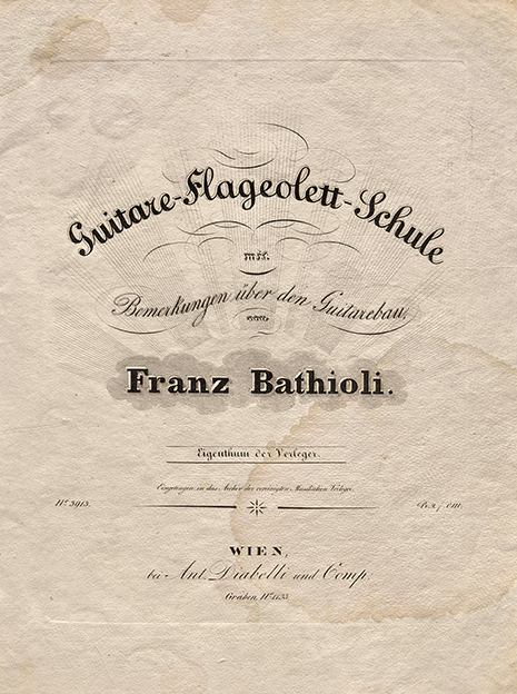 Guitare-Flageolett-Schule mit Bemerkungen über den Guitarebau (« Traité des notes harmoniques, avec des remarques concernant la facture de guitare ») de Franz Bathioli, publié par Anton Diabelli & Comp., Vienne, 1832 (couv. et p. 16). Benediktinertift Seitenstetten.
